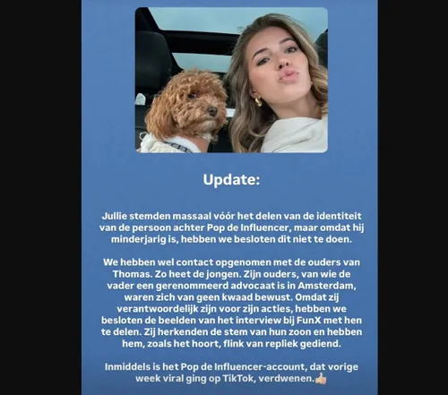 "Jullie stemden massaal vóór het delen van de identiteit van de persoon achter Pop de Influencer, maar omdat hij minderjarig is, hebben we besloten dit niet te doen. We hebben wel contact opgenomen met de ouders van Thomas. Zo heet de jongen. Zijn ouders, van wie de vader een gerenommeerd advocaat is in Amsterdam, waren zich van geen kwaad bewust. Omdat zij verantwoordelijk zijn voor zijn acties, hebben we besloten de beelden van het interview bij FunX met hen te delen. Zij herkenden de stem van hun zoon en hebben hem, zoals het hoort, flink van repliek gediend. Inmiddels is het Pop de Influencer-account, dat vorige week viral ging op TikTok.
