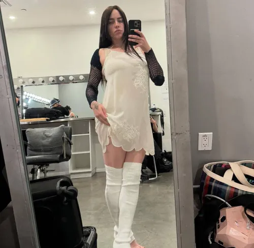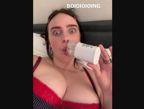 We zien Billie op de foto tijdens haar ochtendroutine terwijl ze in bed lag. Ze filmde zichzelf vanuit een hoek die haar decolleté benadrukte terwijl ze een mini nebulizer gebruikte, die sommige zangers gebruiken om hun stembanden te hydrateren.