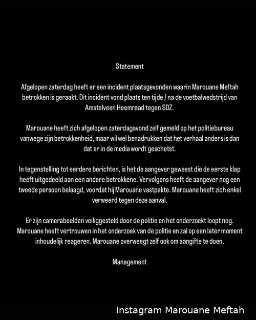 Zijn management is er snel bij om duidelijkheid te scheppen. Volgens hen is het verhaal dat de media schetsen niet compleet. Zij zeggen dat de doelman de eerste klap uitdeelde en daarna nóg iemand belaagde, voordat hij Meftah vastgreep. Wat deed Marouane? Zich verdedigen, volgens zijn team.
