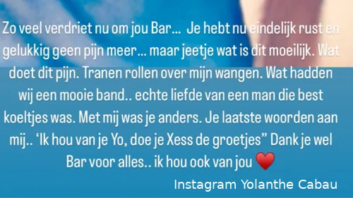 Op Instagram deelde Yolanthe haar gevoelens over het overlijden van Barry. Ze schreef hoe zwaar het afscheid voor haar is en hoe moeilijk het is om te beseffen dat hij er niet meer is. Hoewel Barry bekendstond als een wat gesloten man, bouwde zij een bijzondere band met hem op. In haar bericht blikte ze terug op de momenten die ze samen hebben gedeeld en de liefde die ze voor elkaar voelden.