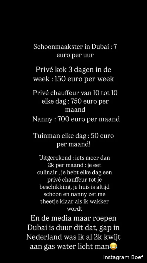 Voor Boef is Dubai niet alleen een zonnige bestemming, maar ook een plek waar hij goedkoper en luxueuzer kan leven. Met €2.000 per maand geniet hij van een comfortabel bestaan, compleet met huishoudelijk personeel, een privékok en een chauffeur. Zijn uitspraken hebben ongetwijfeld tot discussie geleid, maar één ding staat vast: hij heeft geen spijt van zijn keuze. Nederland achterlaten? Voor Boef was het een makkelijke beslissing.
